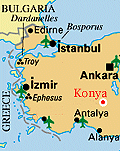 KONYA is located in the heart of the Anatolian plateau (Anadolu)... located 4 hrs. driving distance (158mi/260km) from capital city of Ankara to the south and it is one of Turkey's oldest continuously inhabited sites.